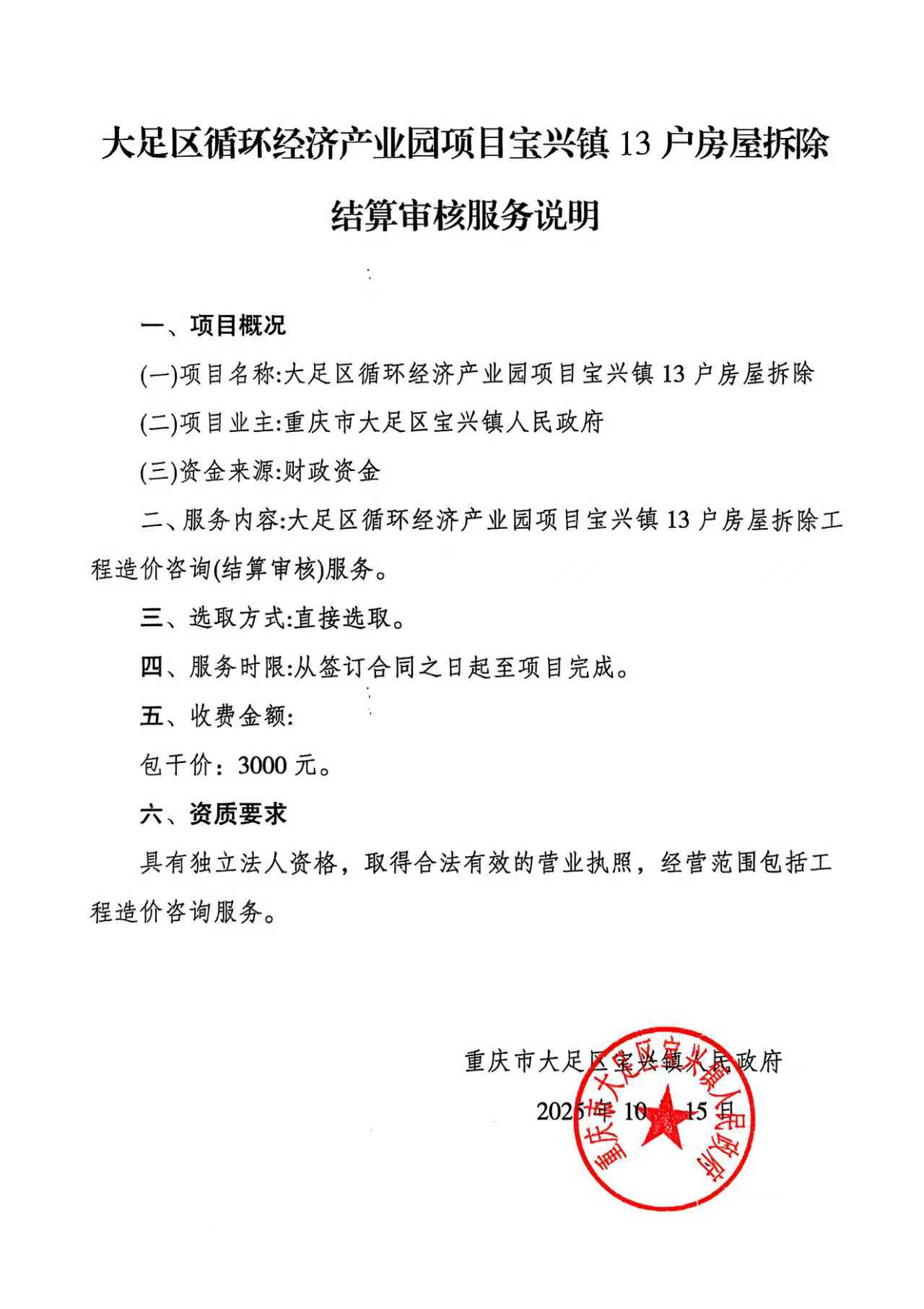 服务内容 | 大足区循环经济产业园项目宝兴镇13户房屋拆除工程造价咨询(结算审核)服务 |