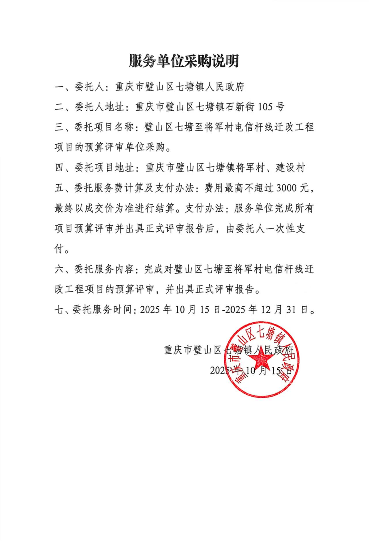 项目名称 | 璧山区七塘至将军村电信杆线迁改工程项目预算评审采购 |